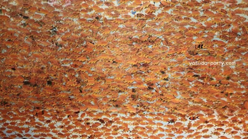 生き物へのメッセージなどを書いて、スイミーみたいな感じで巨大魚を作るイメージ(目はないけど)。